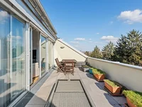You can reach the second attic via an inner rod or comfortably with the lift. It offers access to the kitchen, a spacious 48.67 m2 lounge, a storage room and a guest toilet. The light-flooded lounge opens directly to the spacious terrace with impressive views of the distance and the green.
