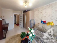 3-room apartment, ag. Chernavchitsy, Trudovaya str., 1968, 1/2 brick, 54.6 / 54.6 / 36.4 / 8.0, bathroom separate, basement (1/8 part), double-glazed windows, interior doors - MDF, metal front door, ceilings - snow and covered with casetons (2.50 m), floors - laminate, walls glued with wallpaper, bathroom modern tile, acrylic bath, gas column (in the kitchen), telephone. Furniture by arrangement. The apartment is in residential condition. The apartment is located on two sides. Gable roof. Take a closer look.