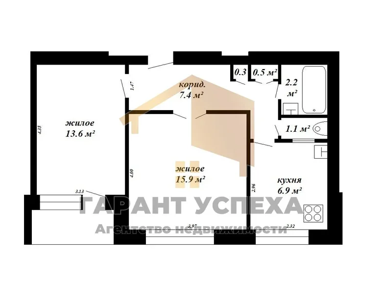 Area: 49.4 sq.m., residential - 29.5 sq.m., kitchen - 6.9 sq.m.
