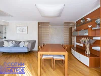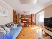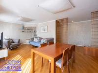Apartment with renovation and furniture. The layout is not standard but interesting: on one side - a large living room of 27 sq.m. with a bay window and a kitchen with a loggia; on the other - three bedrooms (adult with a separate bathroom and dressing room, a children's room and another living room, a small, 8.3 sq.m. with access to the loggia (under the second children's or study). There are enough storage spaces, there is a separate household room (with a boiler and a washing machine), two bathrooms / nodes. The apartment in calm beige colors, classic, a lot of light, a good view from the window.