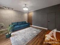2-bedroom apartment, Brest, Lieutenant Ryabtsev St., 2020, 2/2 brick, 78.2 / 77.5 / 43.2 / 13.6, a combined bathroom, loggia, double-glazed windows, metal front door, single-level ceilings with a multifaceted lighting system - from drywall and snow (2.91 m), floors - screed, laminate and tiles (put on a screed), there is a heated floor, walls - electric plaster, a self-contained glass, a shower. Kitchen set, table, refrigerator, microwave oven, oven, bed (in the bedroom), sofa and poof (in the hall), dressing room, washing machine, frame furniture (in the bathroom). Apartment with individual design solutions. The windows face the green area. Clean entrance. In the yard there is a playground, parking for cars. Gable roof. It has its own closed territory. Take a closer look.