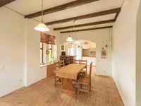 Behind the house there is a garden with fruit trees and an economic entrance. There's a garage underneath. Neighbors are the nicest people who come to their plots to mow the grass.