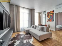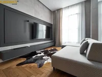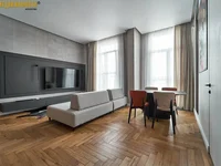 The apartment is fully equipped with all the necessary furniture and appliances: TVs, dishwasher, oven, kitchen hood with downward traction, air conditioning, washing machine, chairs from array, electric curtains with control.