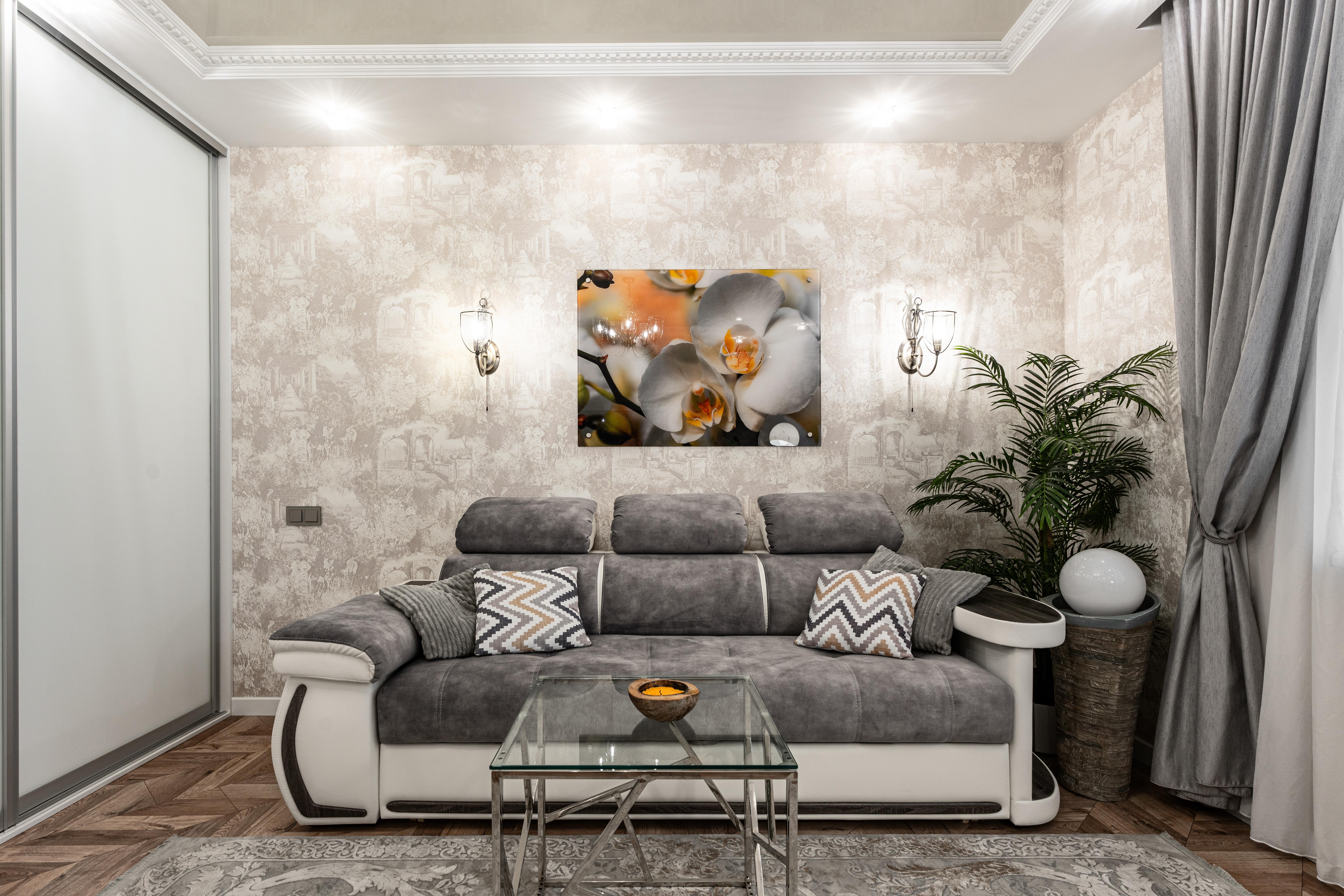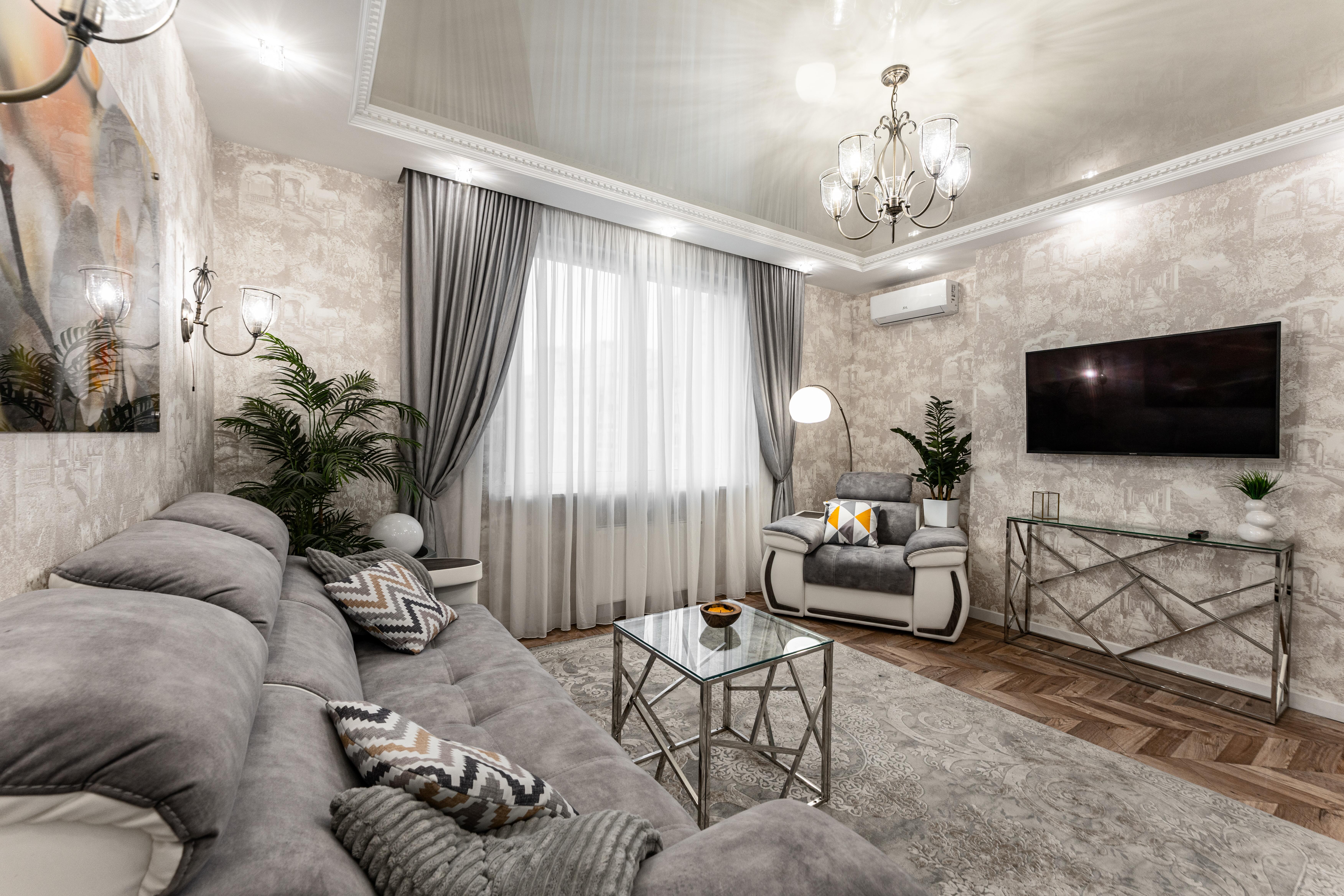 Modern natural materials are used in the decoration of the apartment. In the bathroom - tiles and plumbing of foreign production. The built-in kitchen is equipped with household appliances of European manufacturers: dishwasher, hood, oven, cooking panel and refrigerator.