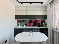 All engineering communications are competently bred throughout the apartment, switches with led lighting and Werkel sockets, high-speed fiber optic Internet; high-quality Rehau windows, mosquito nets, role-curtains, blackout curtains, blinds. Loft lamps, track lighting, adjustable heating radiators. All walls are flat, matte stretch ceilings of Ferico, floor covering: in bedrooms - moisture-resistant laminate (Germany), in bathrooms, hallway and kitchen - wide-format porcelain porcelain (Spain), walls - decorative plaster, in bedrooms - Italian wallpaper (painting under plaster); m / to the door - ecospon, entrance reliable metal door. There are additional storage spaces in the vestibule.