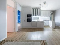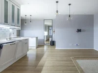 Kitchen and living room. Total area of 27 m2. The kitchen is fully stocked. High-quality furniture on Blum closers and high-quality built-in equipment: refrigerator, induction panel, oven, microwave, dishwasher, hood, there is a water filter. A comfortable working area with an island visually separates the kitchen from the living space.