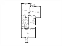 the layout of the apartment includes a spacious living room with a kitchen area of 38.4, three bedrooms, two bathrooms;