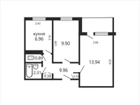 A two-bedroom apartment with isolated rooms is located on the seventh floor of a nine-storey house. The loggia is glazed. Glass windows. PVC. Built-in kitchen with machinery. Wardrobe. Floors, laminate, tiles. New plumbing. Intercom.