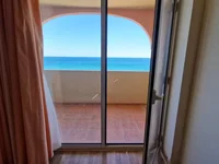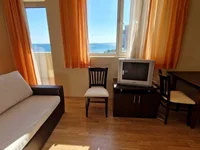 The apartment consists of: a sufficiently spacious hallway, a living room with a kitchenette, equipped with a washing machine, refrigerator, oven, and dining area. In the living room, there is a TV and a sofa. A spacious bedroom with a wardrobe and a view of a large balcony. A bathroom with a toilet and a bathtub, and a large panoramic terrace with a beautiful view of the sea and the beach.