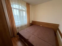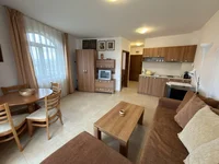 The apartment is fully furnished and equipped with all necessary household appliances. The living room features comfortable upholstered furniture, a dining area, and a well-equipped kitchen. The bedroom is furnished with a double bed and a wardrobe.