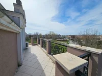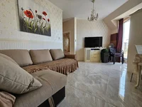 This excellent, fully furnished and equipped two-room apartment on the fourth floor of Izida Palace in Sunny Beach is available for resale. The apartment features modern furniture, a large panoramic terrace, air conditioning in all rooms, and is in excellent condition. The living area measures 88 square meters. The apartment consists of a spacious hallway, a living room, two bedrooms, a separate kitchen, a bathroom, and a large panoramic balcony accessible from all rooms. The spacious and functional kitchen is equipped with all appliances, and each room has floor-to-ceiling windows.