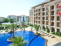 Cascadas Ravda is located along the sea in one of the most beautiful places of the southern Black Sea coast in Bulgaria - a small cozy village of Ravda, just two minutes walk from the sandy beach and 100 meters from the large Aqua Park. It is located in a quiet and peaceful place, with developed infrastructure and amenities for year-round living - grocery stores, banks, restaurants, spa centers, cafes, bus stop. We offer you a bright two-room apartment for sale overlooking the pool. The apartment is located on the third floor with an area of 64.92 sq. m. meters. It consists of a hall, a living room with kitchen and dining room, two bedrooms, a bathroom with toilet and a balcony. The apartment is fully furnished and equipped. Suitable for year-round living. There is garden furniture on the balcony to fully enjoy the charms of spring and summer. The architecture of the building is maintained in the Mediterranean style.The facade is made in warm colors, the balcony railing is designed with wrought iron, and part of the facade of the building is covered with natural travertine. The windows are large, French, with beautifully decorated finishes. The landscape and landscaping emphasize the favorable atmosphere and aesthetics of the internal area - relaxation zones, benches, decorative street lamps, walking paths, park landscaping and palm trees. All this is conducive to a quiet family vacation or year-round residence in the complex. Infrastructure and amenities in the complex: