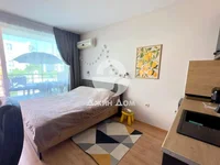 We offer a bright furnished one-room apartment with a view of the pool in the Lesso complex, Ravda village.