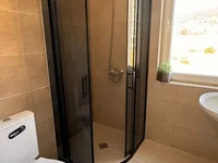 Bathroom: Modern design with a toilet, sink, and a comfortable shower cabin.