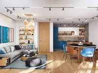 Near the complex, there are a school, a kindergarten, restaurants, and public transport stops. The houses are two-story and three-story buildings, each with its own separate garage or parking space with a capacity for two cars. On the ground floor of each house, there is a living room and a kitchen with a dining area, separated into corners, as well as a storage room and a bathroom with an entrance hall. Parking spaces are available in the southwestern enclosed courtyard.