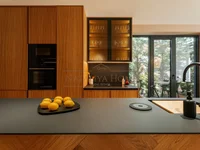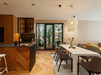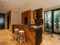 The space is organized with an emphasis on convenience and aesthetics: a bright living area with a dining area and a designer kitchen with an island made according to an individual project and equipped with high-quality Bosch appliances. Panoramic windows from floor to ceiling offer views of the courtyard and fill the house with natural light.