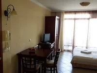 Bestay Property presents a stidio flat on the coast of the Black Sea, first line to Seaside with direct front Sea view, 56.36 square meters, air-conditioned, tastefully furnished and equipped with living room, kitchen, bathroom and a terrace, at first floor, apartment in Bulgaria, in the exclusive resort of Santa Marina in Sozopol.The air-conditioned studio, purchased in 2008 in the first phase of the complex. The advantage is sensational location just off going to the beach, close to the main building reception and mini-market. The studio is fully equipped. The living room has a two-person bed, wardrobe, chest of drawers, a sofa bed, table with chairs and a cabinet with a plasma TV. The apartment has a telephone and internet access. The bathroom has a shower and window access, toilet, hairdryer. The bright kitchen is fully complete – kitchen furniture with equipment: fridge, cooker, microwave oven, electric kettle, as well as cutlery, plates, glasses and pots. With 20 m² terrace extends in a straight line, a scenic first-line view of the bay and the Black Sea.Private, stylish apartment in the exclusive resort of Santa Marina is a perfect place to stay in a convenient location, with unique facilities for rest and recreation in a perfect corner for family holidays, long stays, and even year-round recreation.Resort description