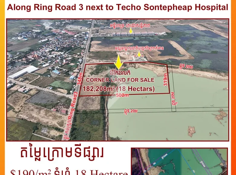 ដីកែង លក់ តម្លៃក្រោមទីផ្សារ ទីតាំង៖ លើផ្លូវកប់ស្រូវ ជិតមន្ទីពេទ្យ តេជោសន្តិភាព ទំហំសរុប៖ 384ម x 500ម សរុប 18 ហិកតា (ផ្លូវ 3 ជុំវិញ) តម្លៃ៖ $190/ម៉ែត្រការ៉េ ដីល្អ សម្រាប់ ធ្វើឃ្លាំង រោងក្រ ឬ សង់អគារ ទំនាក់ទំនងពត៌មានបន្ថែម៖ 077975995