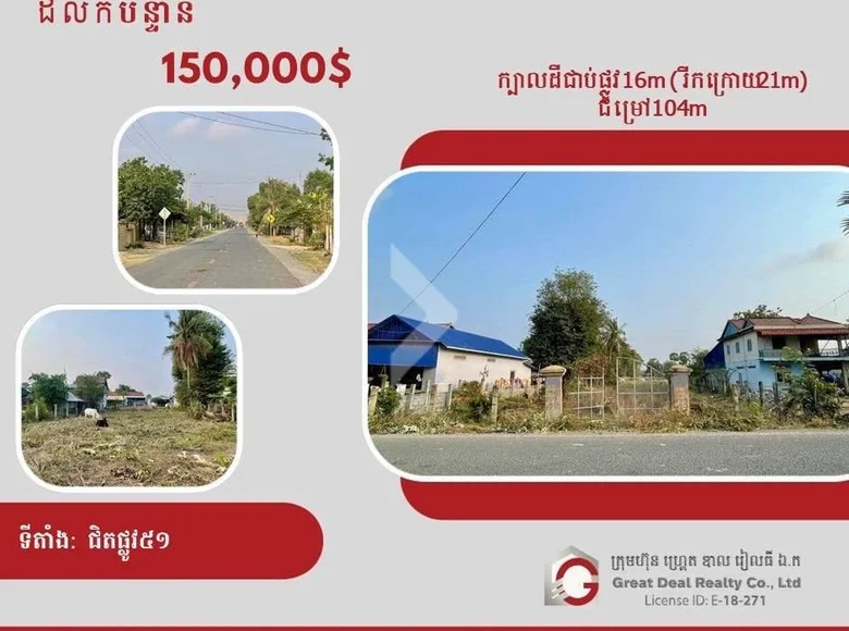 📍ទីតាំង: ក្បែរផ្លូវ51 💲តម្លៃ: $150,000 (ចរចា) ▶️ក្បាលដីជាប់ផ្លូវ ទំហំ16m (រីកក្រោយ 21m) ▶️ជម្រៅ 104m ☎️សម្រាប់ព័ត៌មានបន្ថែម៖ 012 812 218/ 015 812 218/ 087 812 218 PropertyID1869