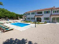 Mini-hotel of 3 attached houses with one pool in a quiet place on the island of Krk. It is a residential unit on two floors, two of which have 80 m2 and one 95 m2. Each house has a separate entrance. The ground floor has a bathroom, kitchen with dining area and living room with access to a covered terrace. On the ground floor there is a fireplace that gives a special atmosphere to the space. Upstairs there is a bathroom and two bedrooms, and a balcony with a relaxing view of nature. There are totally 9 rooms and 6 bedrooms. A special charm of this facility is given by the garden with a swimming pool where you can enjoy the silence, peace and scents of the Mediterranean. In the garden, which has about 1700 m2, in addition to the pool there is a sun deck, shower, barbecue, children's playground and parking spaces.