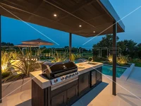 The exterior of each villa is enriched with an outdoor heated pool, sunbathing area, covered terrace for dining, canopy with a summer kitchen, and an uncovered terrace next to the pool and outdoor shower. At the bottom of the yard, there is a firepit.