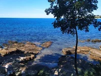The ground floor consists of a hallway, a spacious living room with an open-plan dining room, a kitchen, and a guest bathroom. From the living room, along which modern glass walls extend, there is direct access to the covered terrace and the idyllic, beautiful isolated beach.