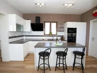 The ground floor has an entrance hall, living room with kitchen and dining room and exit to the terrace and sun deck, which is located next to the pool size 9x4 meters, which also includes a hydromassage. The spacious ground floor also housed one bedroom, a bathroom, a separate toilet and a laundry room.