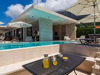 On the first floor of the building there is a spacious living room with a dining room and kitchen, a bedroom with a bathroom. All rooms on this floor have access to a spacious terrace dominated by an outdoor swimming pool with a sun deck lounge. On the eastern side of the terrace is an outdoor kitchen with a grill and an outdoor dining area.