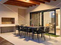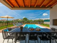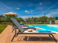 Istria, in the very heart of Istria, a few kilometers from the historic town of Svetvinčenat, is this newly built modern villa with a net area of 270 m2.An interesting project, this beautiful villa is decorated with a stylish interior and spaciousness.Located in a quiet settlement, surrounded by nature, it offers complete peace away from the city noise.The house was built in 2022, paying attention to every detail of the performance.The interior space consists of the ground floor and first floor, which are functionally designed, with lots of natural light.on the ground floor there is a hallway, a fully equipped kitchen, a dining room, a living room with access to the terrace and a summer kitchen, a bedroom with its own bathroom, a toilet and a storage room.Modern stairs lead to the first floor where there are four spacious bedrooms, each with a bathroom, air conditioning and TV. Each room has access to a terrace with a wonderful panoramic view of the greenery.The house is sold fully furnished with stylish furniture.In the garden there is a heated swimming pool of 50 m2 with a sunbathing area, an outdoor shower, additional facilities such as a trampoline, table football…Parking spaces for several cars inside the yard – fenced.The villa started to be rented out for tourist purposes last season and has very good occupancy and income.A great property for all those looking for peace, but also as a property for tourism income.