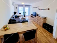 Istria, Pula: An apartment is for sale in Pula, located in a residential building with an entrance from the ground floor, while on the other side it is on the first floor. The apartment has a net area of 55 m² and consists of one bedroom (15 m²), a kitchen with a dining area and living room (29 m²), one bathroom (5 m²), an enclosed loggia, and a terrace 6 meters in length (13 m²). The apartment is equipped with a Mitsubishi air conditioner and has a chimney as an option for heating. The carpentry is PVC with electric shutters, and the windows are thermopane glass filled with argon. The apartment has a B energy certificate and is adapted for people with disabilities. It is sold fully furnished and has one parking space. It is located in a quiet street, close to the city center, restaurants, shops, and the sea, which further increases the attractiveness of this property.