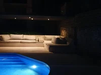 The outdoor area is a highlight, featuring a heated swimming pool lined with the finest Italian tiles. Adjacent to the pool is an outdoor kitchen with a grill, a terrace, and an outdoor shower. The large sofa on the terrace provides a cozy spot to relax and enjoy the gentle Istrian climate.