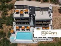 In front of the villa there is a large swimming pool without an edge (11X6) with beautiful sea views as well as a Jacuzzi, a kitchenette, a small bar with tables and chairs and sun loungers for 30 people. In the basement, the additional area leading to the swimming pool consists of a gym, sauna, a room with entertainment content and a smaller apartment with one bedroom, kitchen and one bathroom.