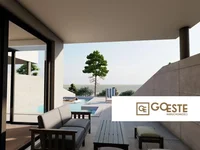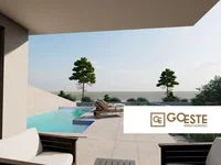 The house with swimming pool and sea view is part of a triple newly built complex located on a plot of 913 m2. Each house has its own swimming pool and is spread over two floors. On the ground floor there is an open concept with dining room and living room, one bedroom and a bathroom. The interior staircase leads to the first floor, which consists of two bedrooms with bathrooms and access to a common terrace with garden furniture. The terrace offers sea views. From the ground floor is access to the outdoor area, which is enriched with swimming pool and sun terrace.