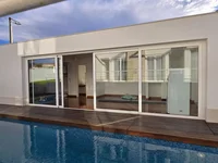 For vehicle accommodation, the property includes four parking spaces, one of which is covered. The villa also boasts two entrance gates, both operated by remote control. Solar panels are installed to heat the pool, while each room is equipped with its own air conditioning unit (11 in total), and the bathrooms are fitted with electric radiators. Additionally, the villa has four wind-sensitive retractable awnings—two on the ground floor and two on the upper level—that automatically close in strong winds.