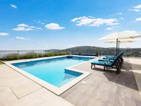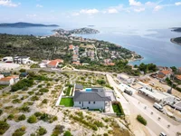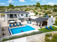 Location: Sevid Built: 2022 Rogoznica center: 15 km Sea: 0.3 km Airport distance: 21 km Inside space: 315 m2 Plot size: 941 m2 Bedrooms: 4 Bathrooms: 5 Swimming pool: 54 m2 Parking: 4 Air-conditioner Gym Sauna Cameras Patio Playground Garden