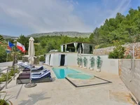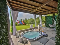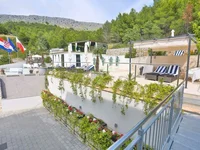 This house comes with a stunning swimming pool on the main terrace just as you walk into the property, and enter the center point of entertainment. There are 3 swimming pools that are connected with each other with stairs. There is a hot tub with a sauna available on the upper terrace in a pergola-shaped lounge area which opens up to wonderful views over the city center of Split and the landscape in the background. The interior design is lavishing and luxurious, topped with marble and high-end material. The house is really meant to be as luxurious as it could be, even with furnishing here we have some high-end materials and house appliances. The spacious interior is a good merge between an eclectic and modern style, really describing the villa as a sophisticated home with a light atmosphere. The house has two big balconies from which you could enter from both bedrooms, leading to those stunning sunsets over the bay and the nearby islands. There are 5 comfortable parking spaces available for private cars in the driveway. There is a small portion of the garden used for mostly aesthetical purposes but has some small portion of local vegetation that really brings up the color into the mostly white/blue theme going on. With all being said this place is ideal for those who are looking for a place with a lot of place for entertainment. With multiple features fulfilling this category, this is an ideal home for someone looking for a vacation home.