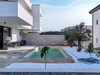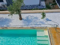 In Punat, a modern semi-detached house is for sale just 500 meters from the sea, featuring a large garage, swimming pool, and stylish design.