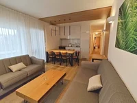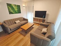 The apartment is a spacious single-level unit. Located in a contemporary building, it occupies the first floor and has a total area of 110 m². This space includes an entrance hallway, a living room with a kitchen and dining area, four bedrooms, three bathrooms, a large covered terrace, and a storage room in the basement. The property is fully furnished with modern furniture and equipped with high-quality, contemporary technical installations. Additionally, the apartment includes a small, well-maintained courtyard of 16 m². The ownership also provides two parking spaces for the new owner.