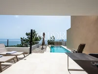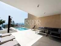 The villa consists of a living room, kitchen, and dining area in an open-plan space with access to a covered terrace and pool. On the same floor, there is also a smaller bathroom. Internal stairs lead to the garage and boiler room or to three bedrooms, of which the master bedroom has its own bathroom and walk-in closet. On the upper floor, there is another larger bathroom and a south-facing terrace with panoramic sea views.