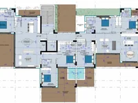 Modern residential six storey building consisting of 15 luxury apartments, communal swimming pools for adults and children, aswell as a gym, lobby, storage rooms for the apartments of the fifth and sixth floors.