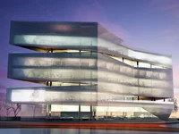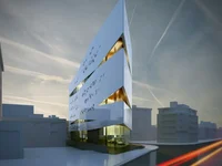 This modern building in central Nicosia, located on the main perimeter road, features a unique design with folds and creases creating a seamless, coherent structure. It includes a ground floor showroom, a mezzanine, three underground parking levels with 110 spaces, and seven floors of luxury office space. The flexible layout allows for various arrangements without uniformity. Advanced electro-mechanical systems, unimpeded views, and a "smart" triple-layer shell providing energy efficiency, shading, ventilation, soundproofing, and controlled lighting highlight its innovative features. The shell's ethereal, translucent character changes throughout the day, enhanced by LED lighting technology.