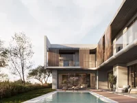 A contemporary-designed villa with a beautiful garden, a double-covered garage, large terraces, and an optional pool. On the ground floor, it features a spacious open-plan living room, dining room, a family sitting area, a modern kitchen, a laundry room, and an office room, all with a view of the garden. It also includes a guest WC. On the first floor, you'll find four bedrooms: the master bedroom with a walk-in wardrobe and an en-suite bathroom, along with three additional bedrooms, each with a wardrobe area and an en-suite bathroom. The house also encompasses a basement apartment with one bedroom, an en-suite bathroom, a living room, a laundry room, and a storage room.