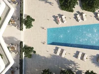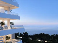 The apartment opens into a stylish open-plan living and dining area, enhanced by floor-to-ceiling windows that frame unobstructed views of the Mediterranean. Natural light floods the interiors, while sliding doors extend the space onto a private balcony for seamless indoor-outdoor living.