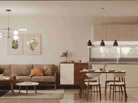 The open-plan living and dining area forms the heart of the apartment, creating a bright and functional space ideal for modern lifestyles. Large sliding doors connect the interiors to a spacious veranda, extending daily life outdoors.