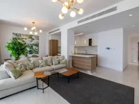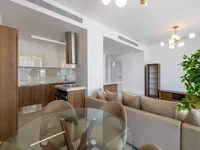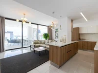 The residence features a bright living room with full-height sliding doors, a contemporary open-plan kitchen, three elegant bedrooms, and two beautifully appointed bathrooms. A spacious covered veranda and a private rooftop garden with panoramic sea and city views provide the ideal setting for outdoor dining, relaxation, or entertaining.