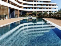 The apartment features an open-plan living area with kitchen, 1 bedroom, 1 bathroom, and a balcony. High ceilings (3.15 m), thermal aluminum windows, and premium finishes create a bright and elegant living space. Residents have access to top-class amenities: heated indoor pool, spa, gym, landscaped gardens, clubhouse, and secure underground parking.