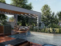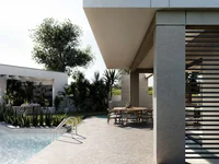 A spacious open-plan kitchen, dining, and living area opens to landscaped gardens, a skimmer pool with a water curtain, and a fully equipped BBQ area. A guest toilet, external storage room, and outdoor bathroom enhance the functionality of this level.
