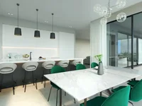 The kitchen area exudes sophistication with a bright neutral color palette, featuring elegant marble counters and floors, accented with touches of color.