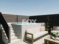 The featured apartment is a top-floor two-bedroom unit with a roof garden, offering an internal area of 82 sqm and a 33.7 sqm covered veranda. The roof garden spans 42.5 sqm and includes a private pool with breathtaking views. The apartment also comes with covered parking and a storage room. Inside, you will find an open-plan kitchen with a living and dining area, a main bathroom with a shower, a master bedroom with an en-suite bathroom, and another spacious bedroom. The living room opens to a large veranda through expansive sliding windows, and a spiral staircase provides access to the stunning roof garden.