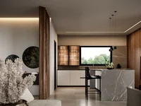 At the first level, a whole open space is designed: the kitchen, living room and dining room flow smoothly into each other and go out onto the terraces. There is also a guest bedroom with its own bathroom - a cozy and private place for visitors.
